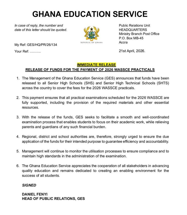 In an official statement dated April 26, 2026, the Ghana Education Service confirmed that the funding is intended to support all practical examinations scheduled for the 2026 WASSCE.