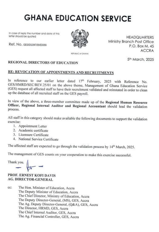 In reference to our earlier letter dated 17th February 2025, with Reference No. GES/HMRD/SEC/REV.25/01 on the above subject, the Management of the Ghana Education Service (GES) requests all affected staff to undergo validation and reinstatement to ensure a clean database of all recruited personnel on the GES payroll.