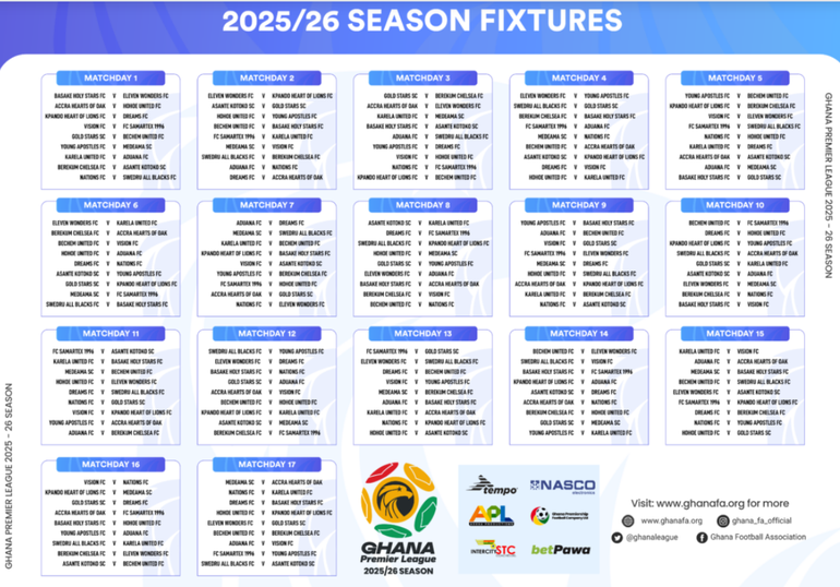 GFA releases 2025/26 Ghana Premier League fixtures - Hearts v Kotoko clash early