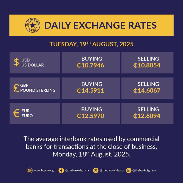 On Tuesday, 19 August 2025, the interbank exchange rates in Ghana showed the US dollar trading at a buying rate of GH¢10.7946 and a selling rate of GH¢10.8054. The British pound sterling was quoted at GH¢14.5911 for buying and GH¢14.6067 for selling, while the euro recorded a buying rate of GH¢12.5970 and a selling rate of GH¢12.6094.