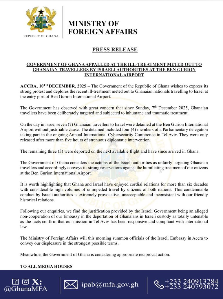 The Ministry noted that, since Sunday, 7 December 2025, Ghanaian travellers have been deliberately targeted and subjected to inhumane and traumatic treatment. According to the statement, seven (7) Ghanaian nationals were detained without justification, including four (4) Members of Parliament travelling to Tel Aviv for the Annual International Cybersecurity Conference.