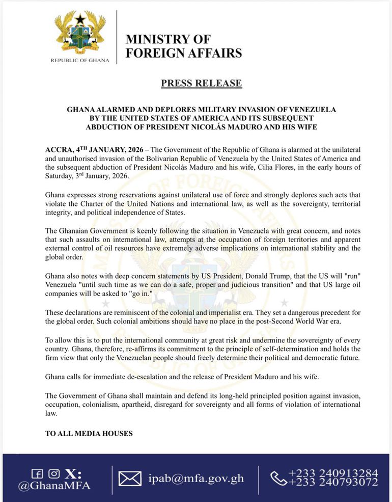 In a statement issued by the Ministry of Foreign Affairs dated 4 January 2026, Ghana said it was alarmed by developments in Venezuela, which reportedly unfolded in the early hours of Saturday, 3 January 2026.