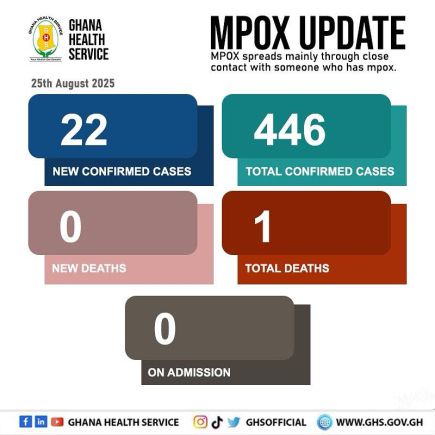 The Ghana Health Service (GHS) has announced the detection of 22 new cases of Mpox, pushing the country’s cumulative total to 446 infections as of 25 August 2025.