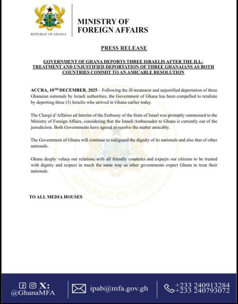 According to a statement issued by the Ministry of Foreign Affairs and Regional Integration, the three Israelis were removed from the country on Tuesday, 10 December 2025, shortly after their arrival in Accra.