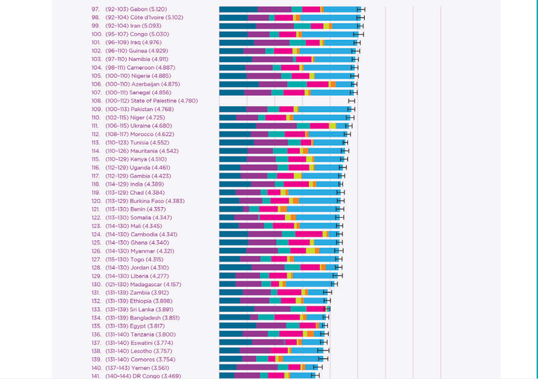 Ghana's 125th ranking places it behind Burkina Faso (120th), Benin (121st), and Somalia (122nd) but ahead of Togo (126th) and Liberia (129th).