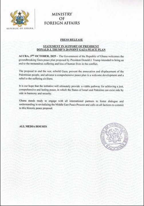 The Government of Ghana has officially endorsed the 20-point peace proposal unveiled by United States President Donald Trump to restore stability in Gaza. In a statement issued by the Ministry of Foreign Affairs, Ghana described the plan as a groundbreaking initiative to end the prolonged suffering of civilians in the war-torn region.