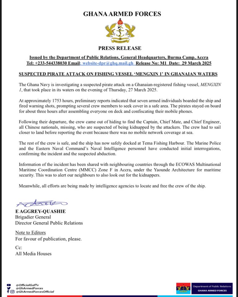 According to a press release issued by the Ghana Armed Forces on Saturday, March 29, the attack took place at approximately 5:53 PM when seven armed individuals boarded the vessel and fired warning shots.