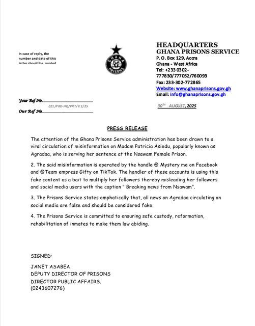 The Ghana Prisons Service has refuted viral social media claims suggesting troubling developments regarding Madam Patricia Asiedu, popularly known as Agradaa, who is currently serving her sentence at the Nsawam Female Prison.