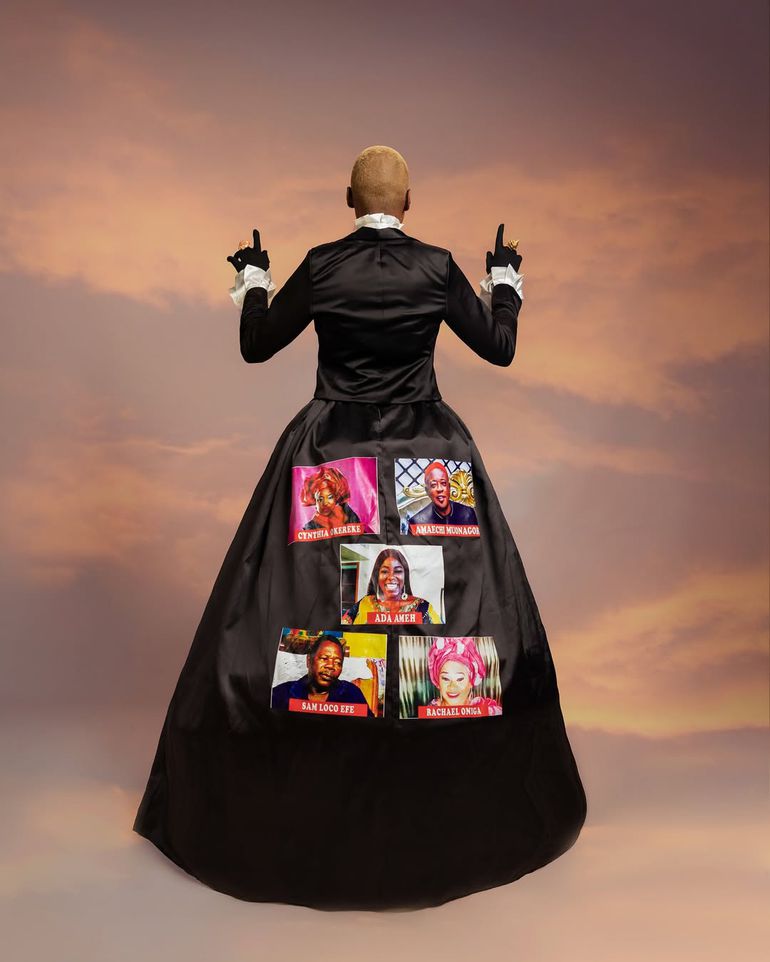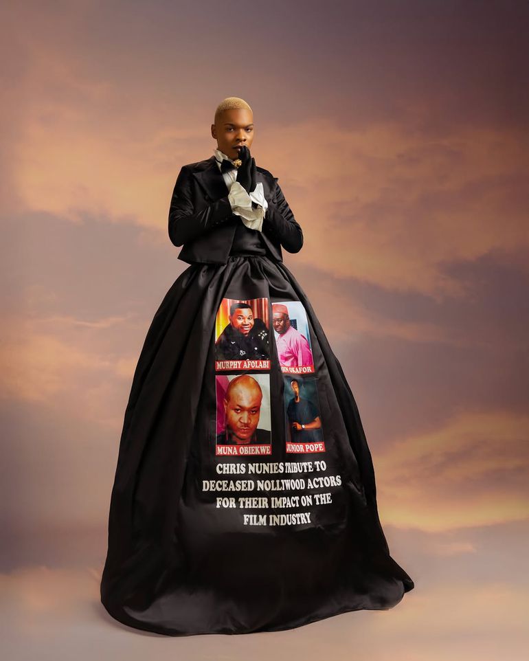 Stylist Chris Nunies made a poignant statement by incorporating images of late Nollywood stars, including Mr. Ibu, Junior Pope, and Muna Obiekwe, into his ensemble.