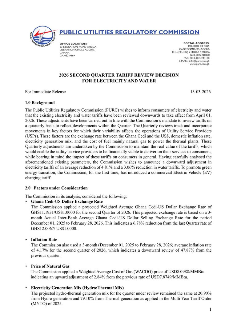 The Public Utilities Regulatory Commission (PURC) has announced a reduction in electricity and water tariffs to take effect from April 1, 2026, following its second quarter tariff review.