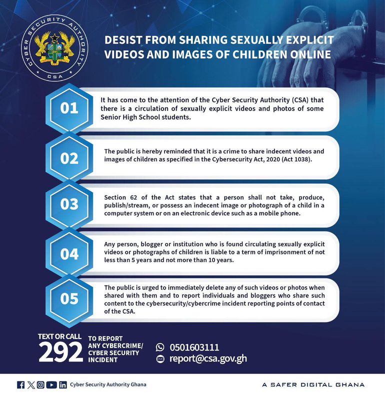 The Cyber Security Authority (CSA) has issued a strong public warning following reports of sexually explicit videos and photographs involving Senior High School students being widely shared online.