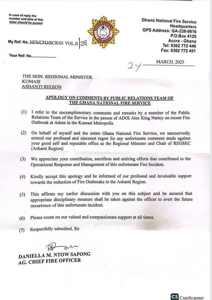 In a statement dated 24th March and signed by Acting Chief Fire Officer Daniella M. Ntow-Sapong, the GNFS apologised for the incident, describing Mr Nartey’s remarks as “uncomplimentary.”