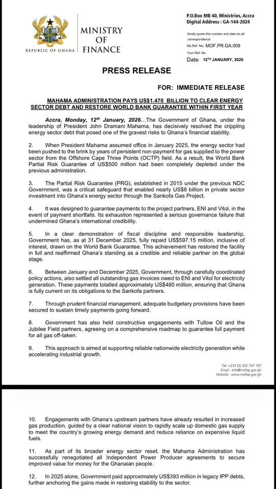 The Government of Ghana says it has successfully resolved the long-standing energy sector debt crisis and fully restored the World Bank Partial Risk Guarantee within the first year of President John Dramani Mahama’s administration.