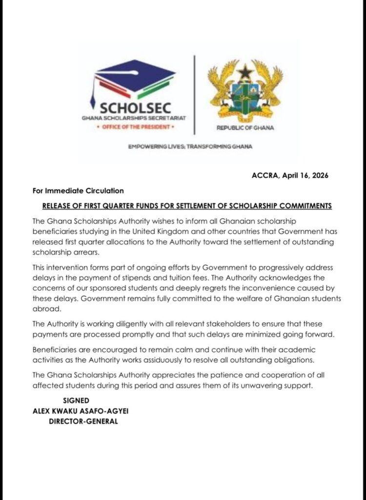 In a statement issued on April 16, 2026, Alex Kwaku Asafo-Agyei Director-General, the Ghana Scholarships Authority said the funds will be used to settle arrears owed to beneficiaries in the United Kingdom and other countries.