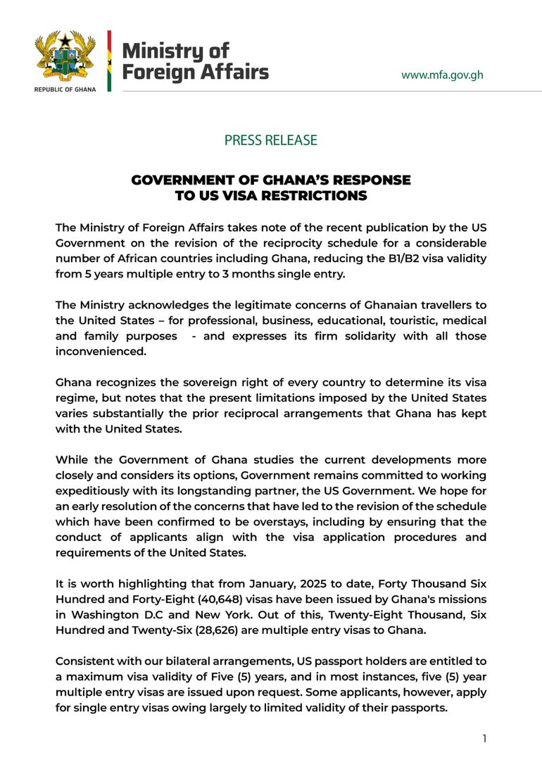 Ghana has formally expressed concern over the United States’ decision to drastically reduce visa validity for Ghanaian citizens, calling for urgent dialogue while reaffirming its commitment to strong bilateral relations.