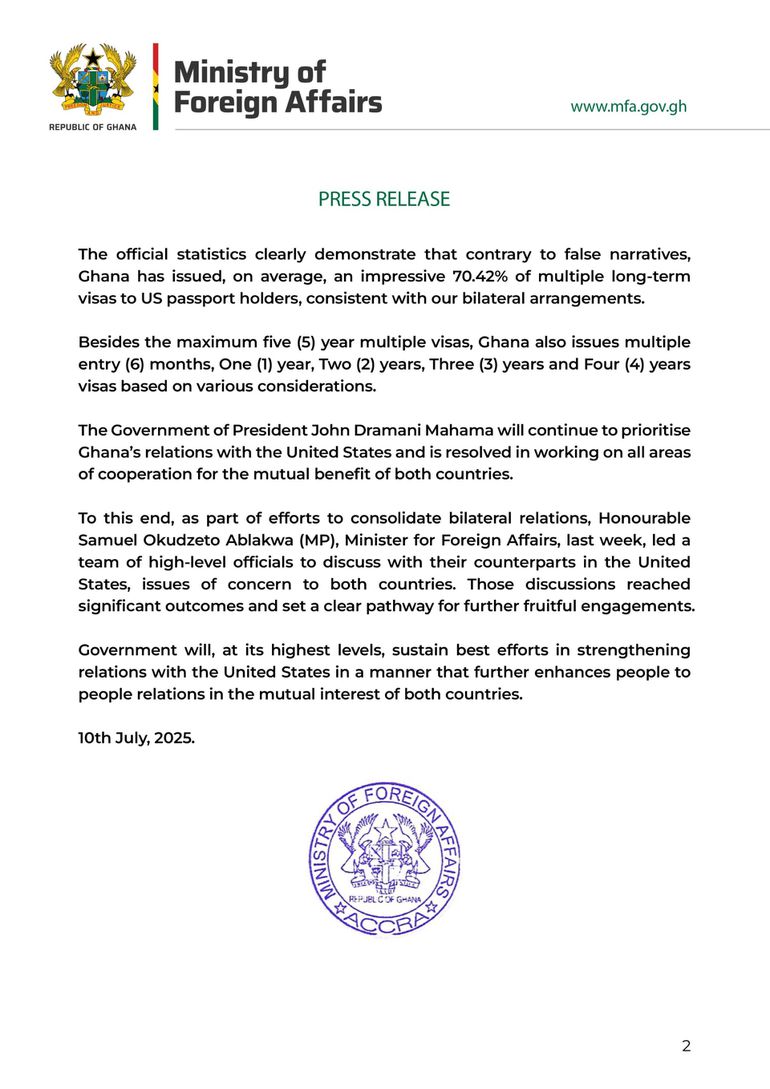 The ministry highlighted that Ghana had maintained its end of the reciprocity agreement, issuing long-term multiple-entry visas to US citizens.
