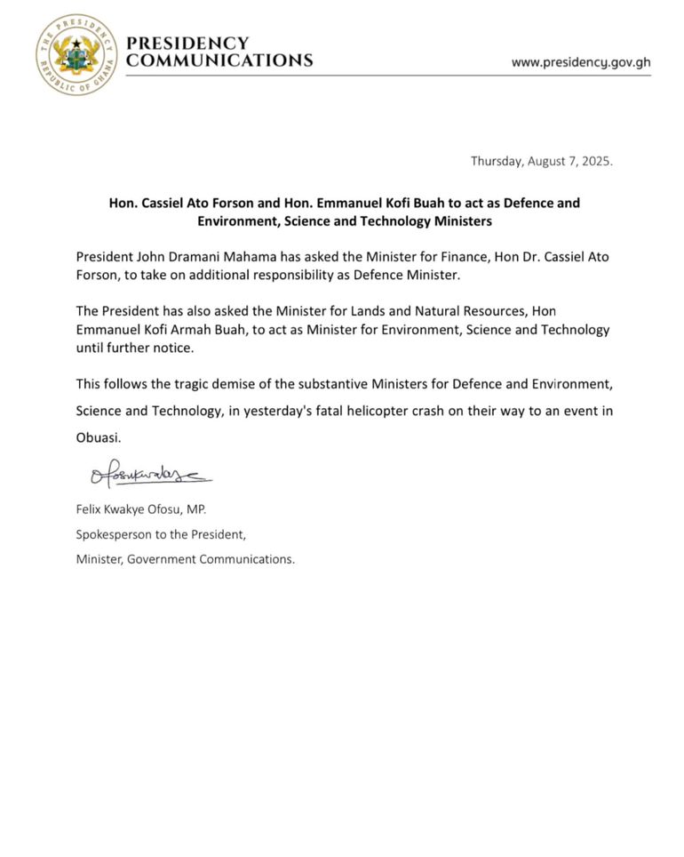 The announcement follows the tragic deaths of Dr Omane Boamah, former Minister for Defence, and Dr Ibrahim Murtala Muhammed, former Minister for Environment, in a Z-9 military helicopter crash at Adansi-Akrofuom in the Ashanti Region on the morning of Wednesday, 6 August 2025.
