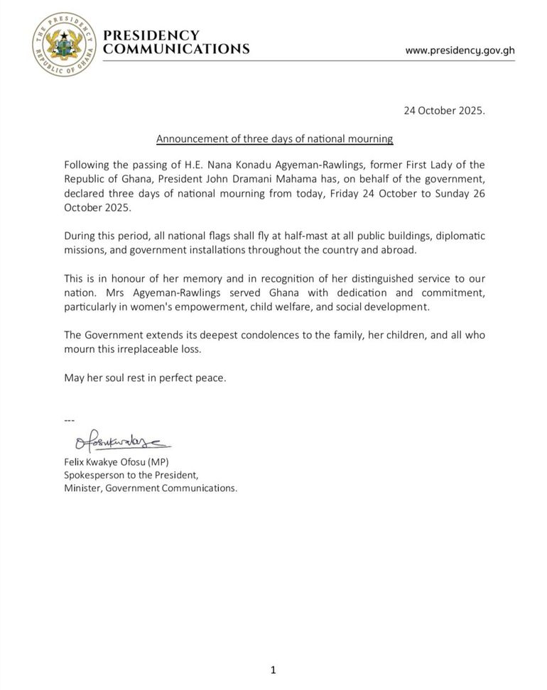 President John Dramani Mahama has declared a three-day national mourning period from Friday, 24 October to Sunday, 26 October 2025, in honour of the late former First Lady, Nana Konadu Agyeman-Rawlings.