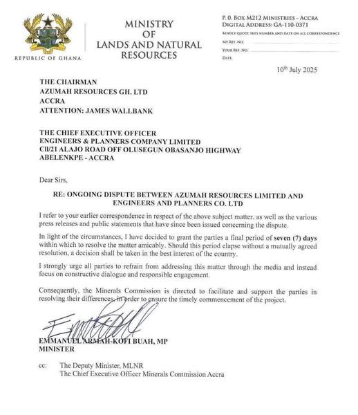 The Minister for Lands and Natural Resources, Emmanuel Armah Kofi-Buah, has issued a seven-day ultimatum to Engineers & Planners and Azumah Resources to resolve their ongoing dispute over the Black Volta Gold Mine.