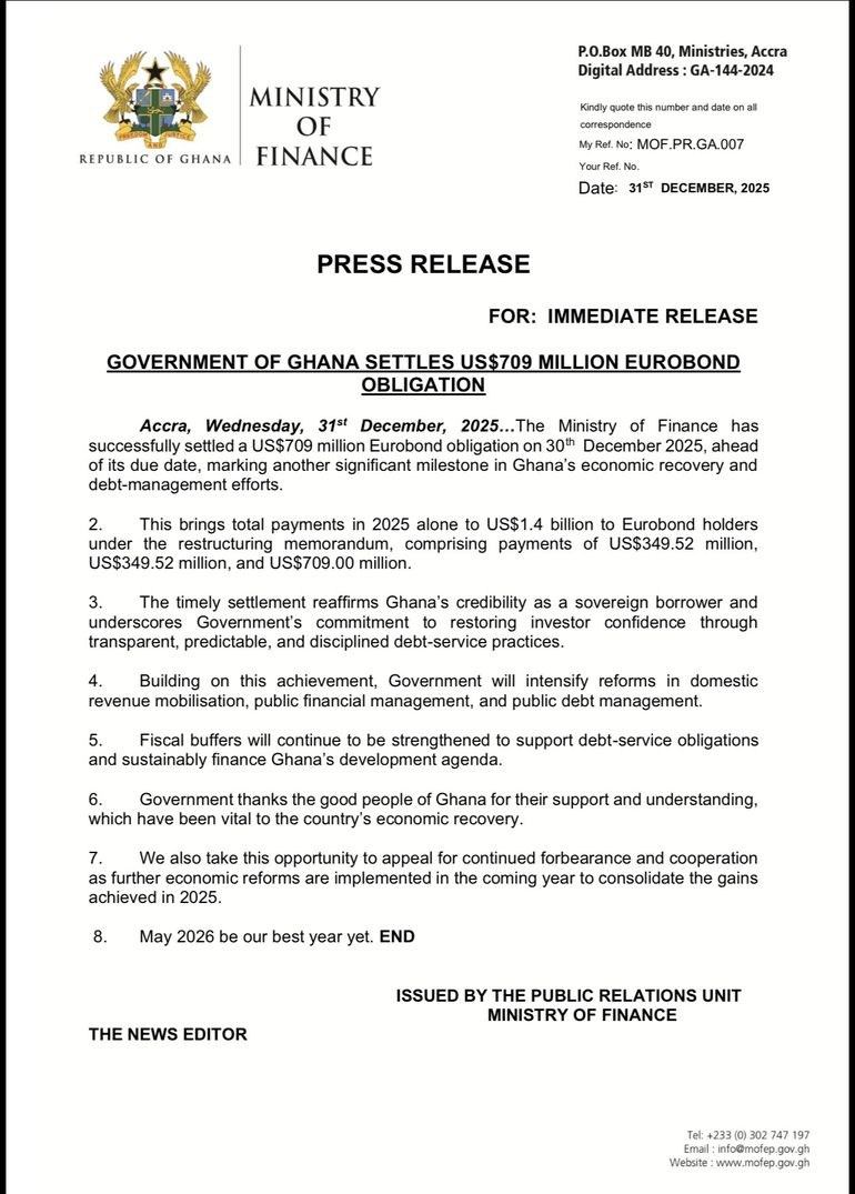 According to the Ministry, the timely settlement reinforces Ghana’s credibility as a sovereign borrower and demonstrates government’s commitment to restoring investor confidence through transparent, predictable and disciplined debt-servicing practices.