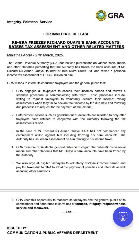 The Ghana Revenue Authority (GRA) has confirmed issuing an income tax assessment for Ghanaian businessman and founder of Bills Micro Credit Ltd, Richard Nii Armah Quaye, while clarifying that it has not frozen his accounts.