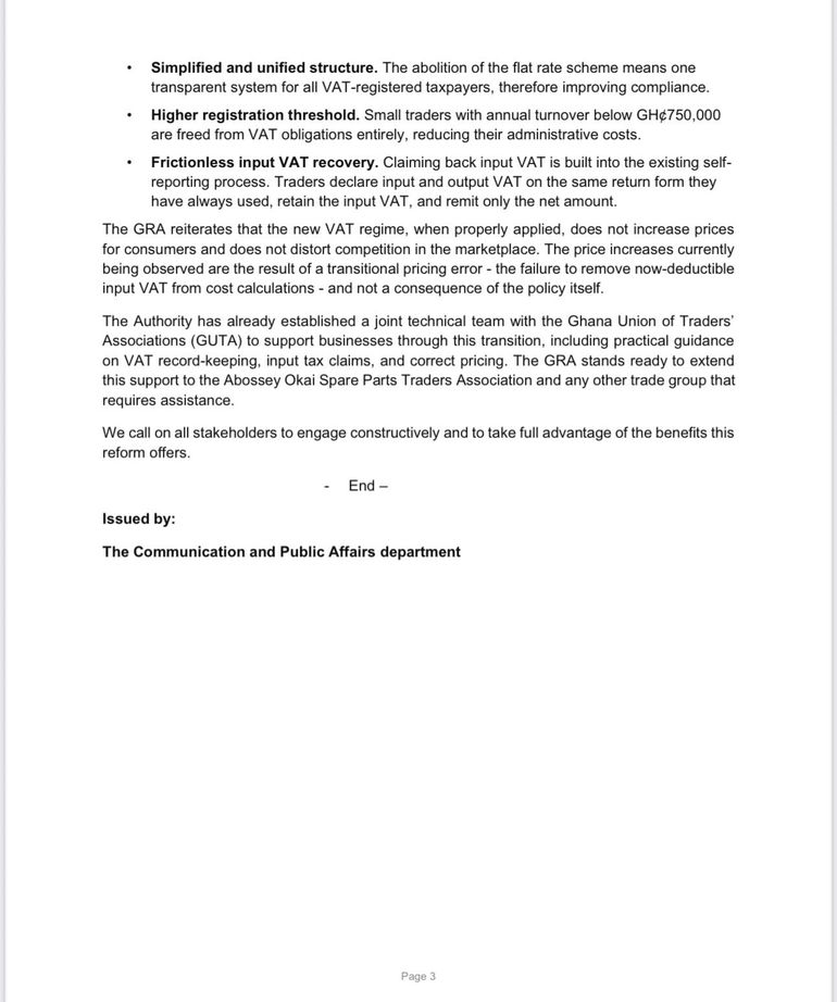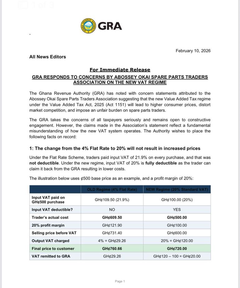 The Ghana Revenue Authority (GRA) has responded to concerns raised by the Abossey Okai Spare Parts Traders Association over the implementation of the new Value Added Tax Act, 2025 (Act 1151), insisting that the reforms will not lead to higher consumer prices or distort competition.