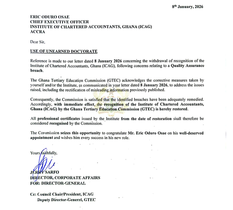 The Ghana Tertiary Education Commission (GTEC) has restored the recognition of the Institute of Chartered Accountants, Ghana (ICAG), following corrective steps taken to address concerns over the use of an unearned doctoral title by its Chief Executive Officer, Eric Oduro Osae.
