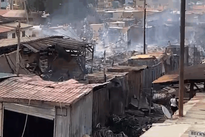 The fire destroyed more than 50 wooden structures and metal containers, displacing numerous residents and causing extensive property damage.