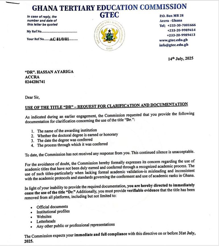 As a result, GTEC directed Mr Ayariga to stop using the title and provide verifiable evidence that it has been removed from all platforms. These include official documents, institutional profiles, websites, letterheads and any other public or professional representations. The Commission set 31st July 2025 as the deadline for full compliance.