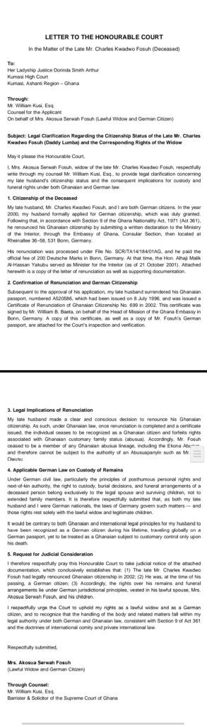 Addressing Ladyship Justice Dorinda Smith Arthur through her lawyer, Mr William Kusi, Esq., she argued that her late husband was a German citizen, not a Ghanaian, and therefore matters concerning his remains and funeral arrangements fall under German jurisdiction, which vests such rights exclusively in the lawful spouse and children.