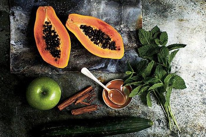 Ingredients1 green papaya, unripened, peeled and seeds removed1 medium-sized cucumber, unpeeled1 green apple, unpeeledA handful of mint1 tsp raw honey1 tsp ground cinnamon