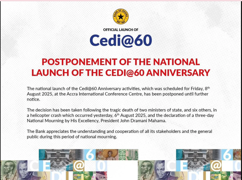 The Bank of Ghana has indefinitely postponed the national launch of its Cedi@60 anniversary celebrations, which were scheduled for Friday, 8 August 2025. The postponement is in alignment with the national mourning period declared by President Mahama.