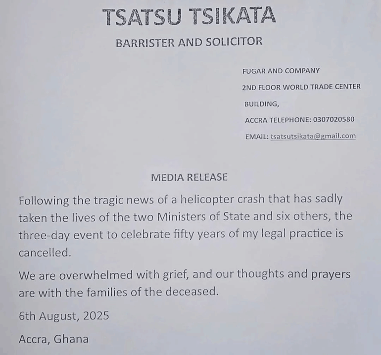 Celebrated legal icon Tsatsu Tsikata has called off a three-day event commemorating his 50 years in legal practice. In a statement issued on Wednesday, 6 August, Mr Tsikata said: