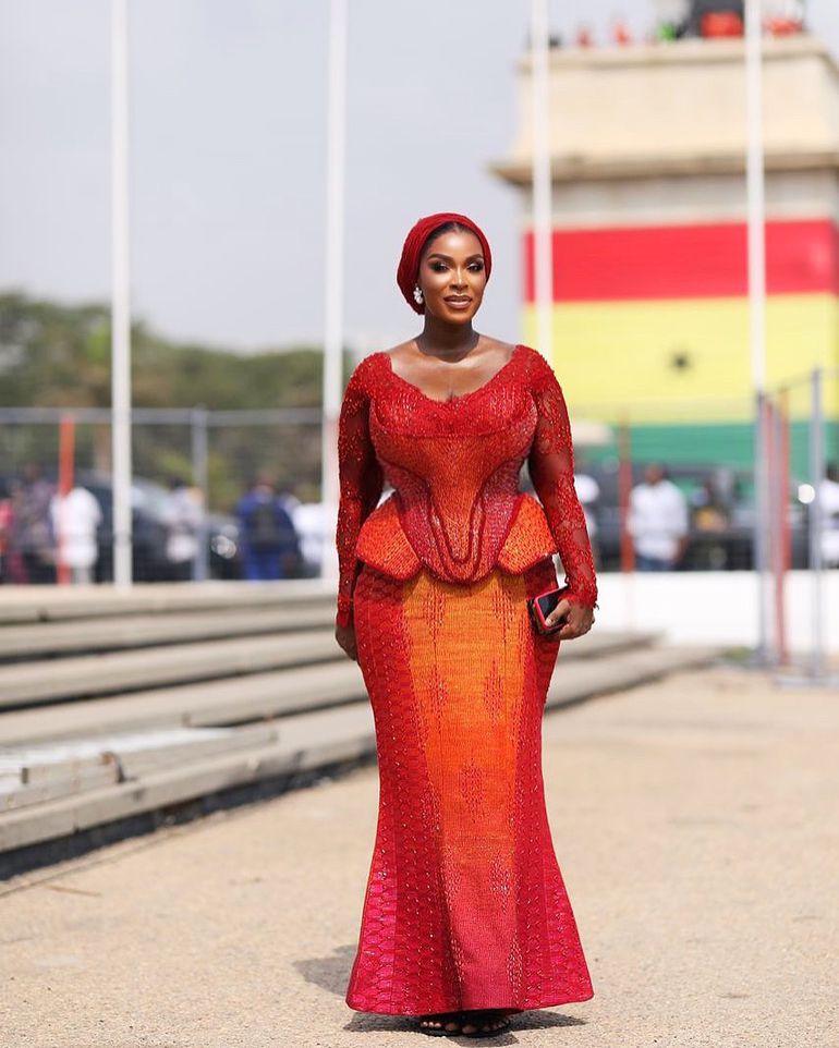 John Dumelo's wife turned heads at Mahama's swearing-in ceremony with her elegant kente outfit. The stunning ensemble featured a radiant red and orange ombré design, blending traditional Ghanaian craftsmanship with modern style.