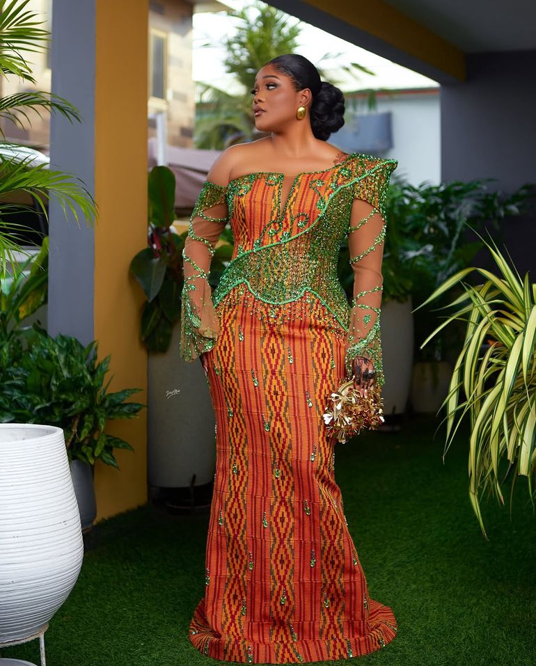 Akosua Vee is adorned in a stunning orange and green kente gown that elegantly blends traditional Ghanaian textiles with a modern design.