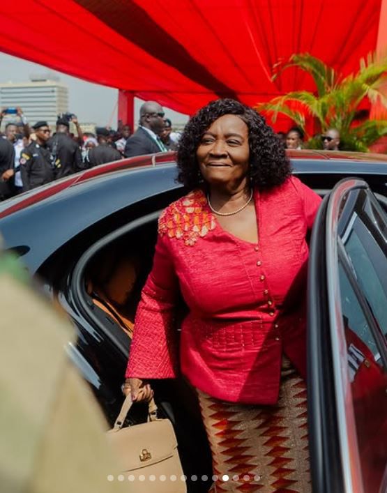 Jane Naana Opoku-Agyemang was dressed in a vibrant red blouse adorned with intricate floral embroidery on one shoulder, adding a touch of elegance.
