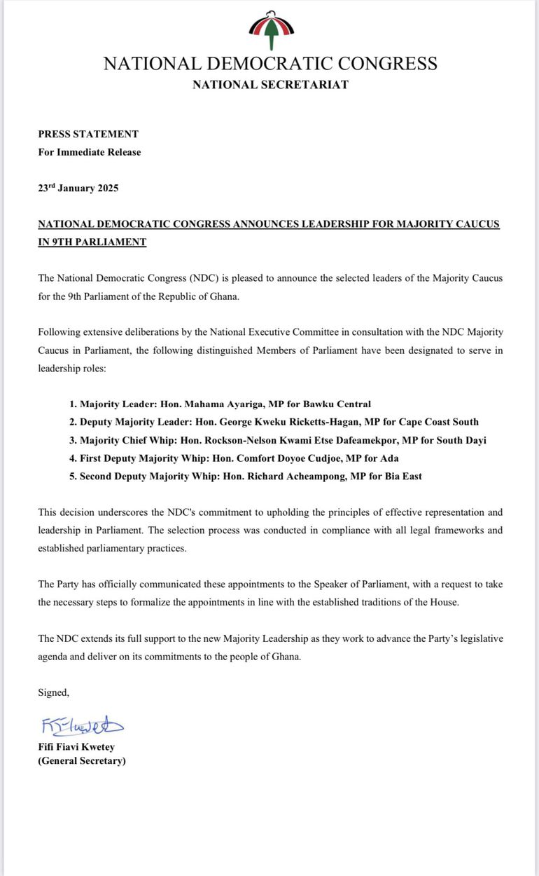 The ruling National Democratic Congress (NDC) has announced the new leadership for the majority caucus in the 9th Parliament of Ghana’s 4th Republic. The reshuffle was communicated to the Speaker of Parliament, Alban Bagbin, in a letter dated Thursday, 23rd January, and signed by the NDC’s General Secretary, Fifi Fiavi Kwettey.