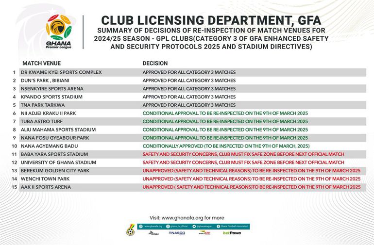 Following the inspections, five venues were fully approved to host ongoing GPL matches: TNA Stadium, Dr Kwame Kyei Sports Complex, Dun's Park Bibiani, Nsekyire Sports Arena, and Kpando Sports Stadium.
