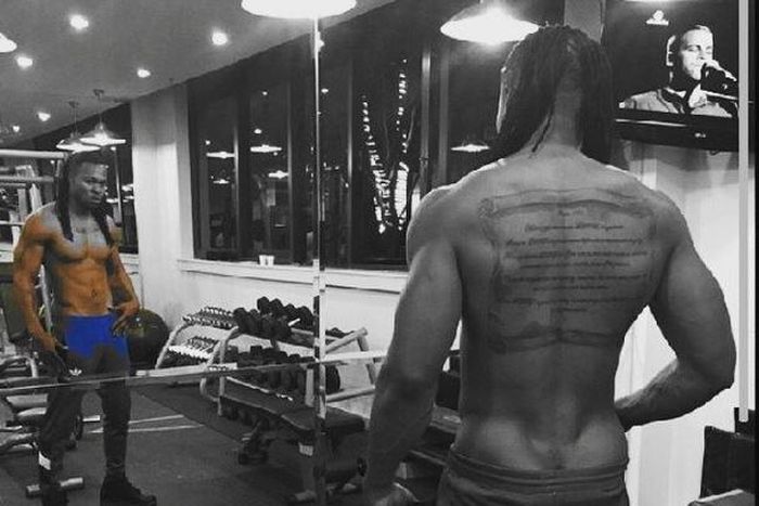 The award winning act can be seen in front of a mirror with his back to the camera. The picture offers two views, Flavour's chiseled chest and his bare back, and a slight exposure of his butt crack.