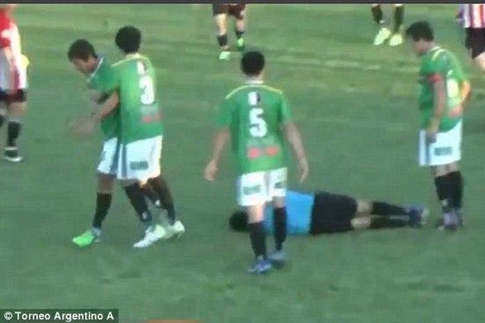 A referee was knocked out in second division game between Ferro and Tiro in Argentina by a player he showed a yellow card.