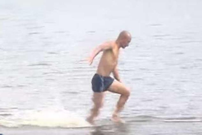 According to a report on New China TV, Shi Liliang trained for more than ten years in his attempts to run on water and used floating boards for support.