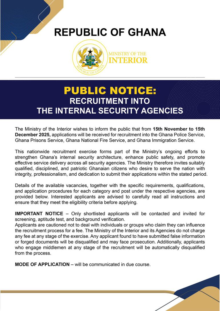 The Ministry of the Interior has announced the commencement of a nationwide recruitment exercise for Ghana’s key security agencies: the Ghana Police Service, Ghana Prisons Service, Ghana National Fire Service, and Ghana Immigration Service.