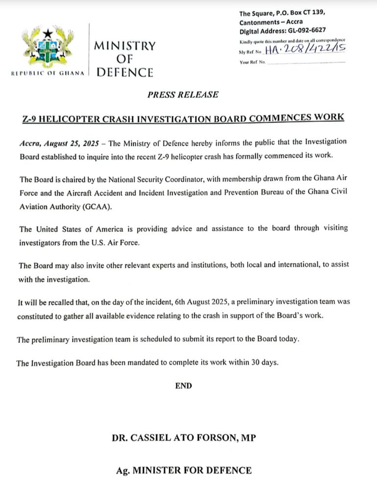 The Investigation Board established by government to probe the Z-9 military helicopter crash at Adansi Akrofuom has officially commenced work.
