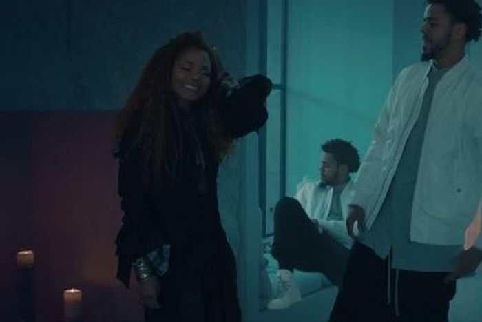 In the clip, Jackson is seen walking around a beautiful mansion as she sings the sultry words to the song. About three minutes in, J. Cole appears lounging on a couch as he raps about “staying up for hours” and getting “drunk off love.”