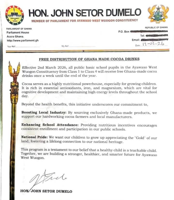 Member of Parliament for Ayawaso West Wuogon, John Setor Dumelo, has announced the distribution of Ghana-made cocoa drinks to all public basic school pupils from Class 1 to Class 4 in the Ayawaso West Wuogon Constituency, beginning March 2, 2026.