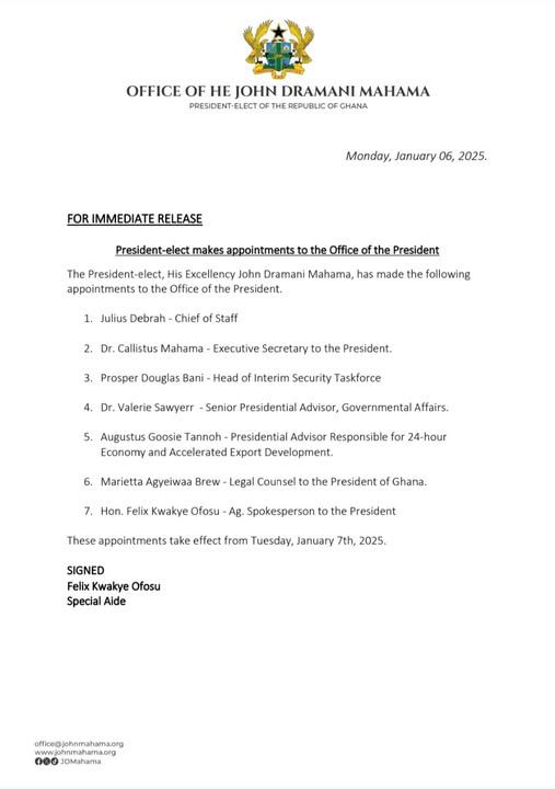 President-elect John Dramani Mahama has officially announced his appointments to the Office of the President in his upcoming administration. The announcement comes less than 24 hours before the presidential inauguration ceremony.