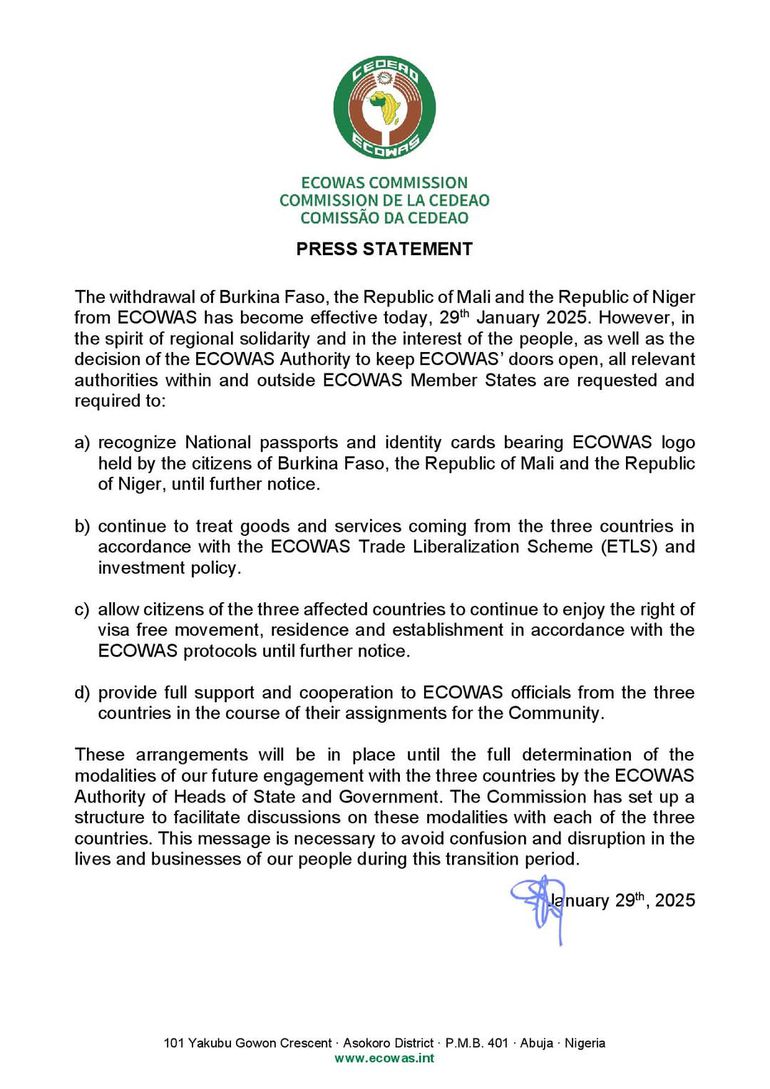 Mali, Niger, and Burkina Faso, all governed by military juntas, have officially withdrawn from the Economic Community of West African States (ECOWAS), effective today, January 29, 2025.