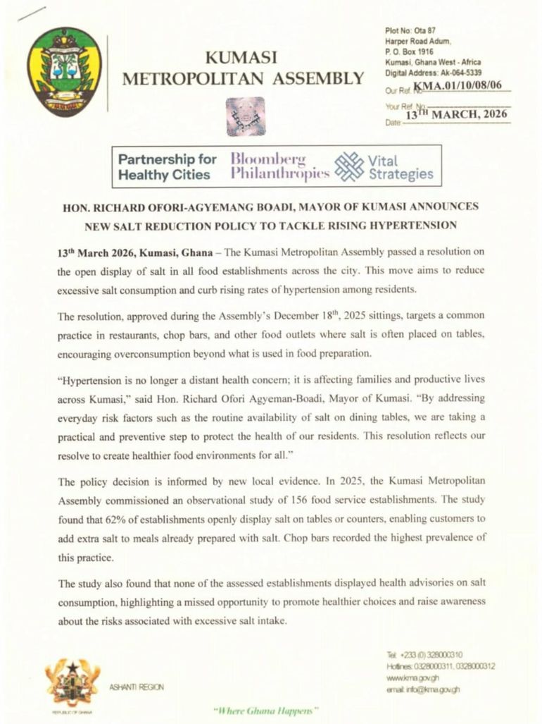 The announcement was made by the Mayor of Kumasi, Richard Ofori-Agyeman Boadi, on March 13, 2026. The policy seeks to end the open display of salt on tables in restaurants, chop bars and other food outlets, a practice authorities say encourages customers to add extra salt to meals that are already prepared with salt.