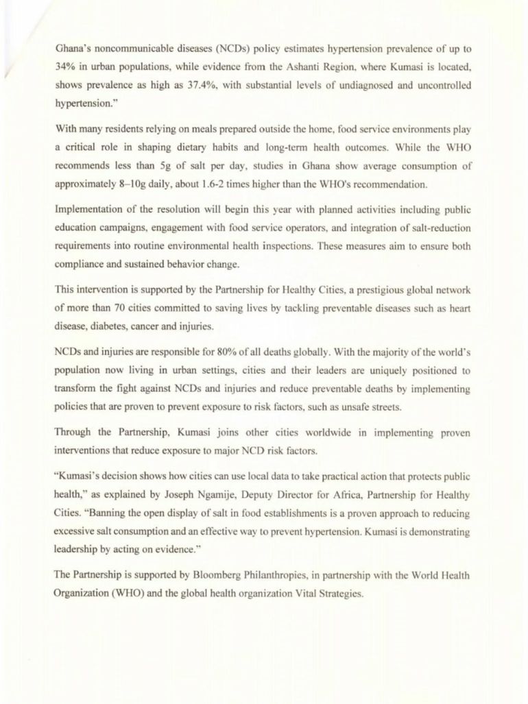 The Kumasi Metropolitan Assembly has announced a new policy aimed at reducing excessive salt consumption in food establishments across Kumasi as part of efforts to address the rising cases of hypertension among residents.