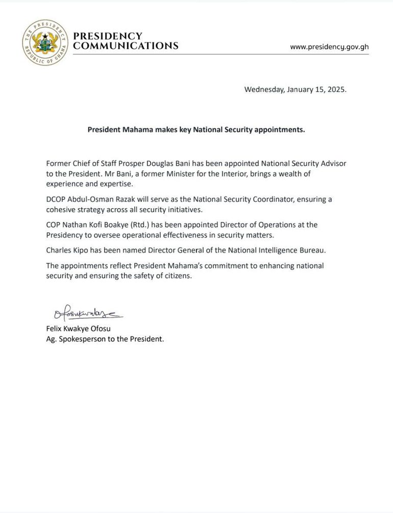 According to a communiqué issued by Felix Kwakye Ofosu, the Acting Spokesperson of the President, on Wednesday, 15th January 2025, the appointments reflect the government’s commitment to enhancing national security.
